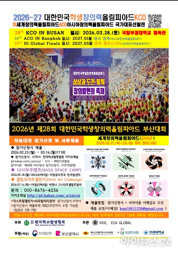 [아이뉴스24 이윤 기자] 대한민국 최대 규모의 학생 창의력 경연대회인 ‘2026 제28회 대한민국학생창의력올림피아드(KCO)’가 내달 28일 부산 국립부경대학교 체육관에서 화려하게 막을 올린다.